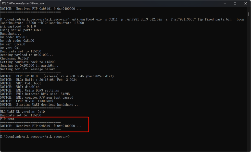 D:\Downloads\mtk_recovery\mtk_recovery>.\mtk_uartboot.exe -s COM11 -p .\mt7981-ddr3-bl2.bin -a -f mt7981_360t7-fip-fixed-parts.bin --brom-load-baudrate 115200 --bl2-load-baudrate 115200