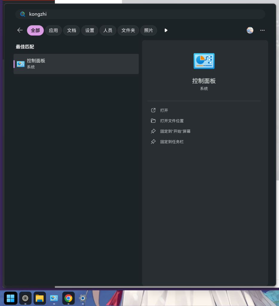 可以在开始菜单搜索控制面板打开